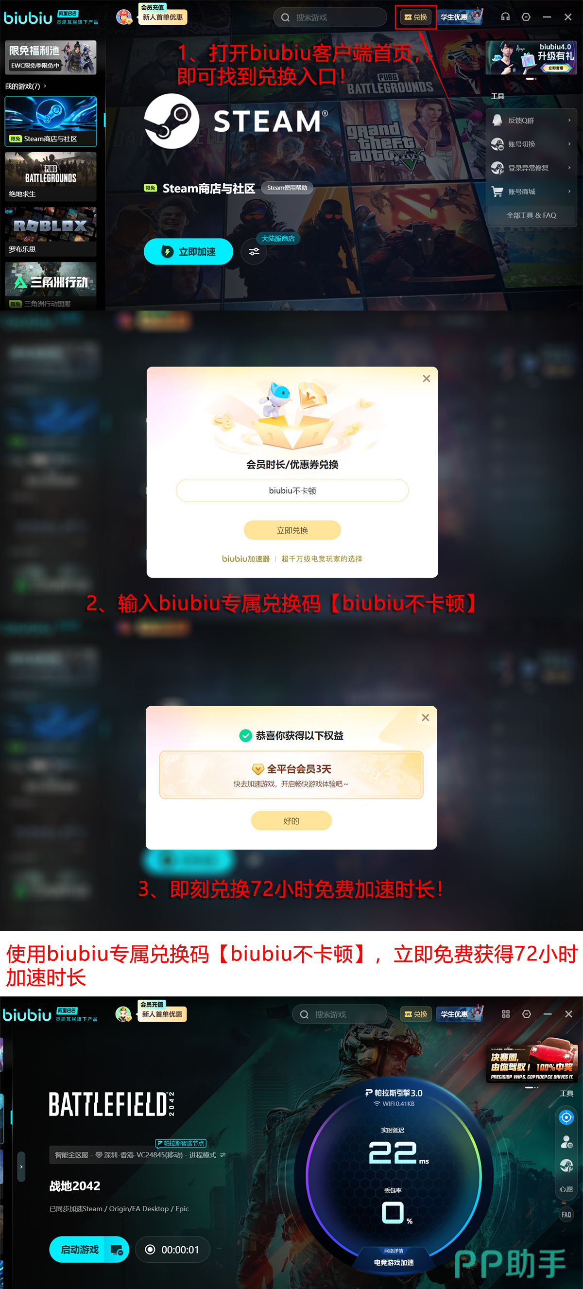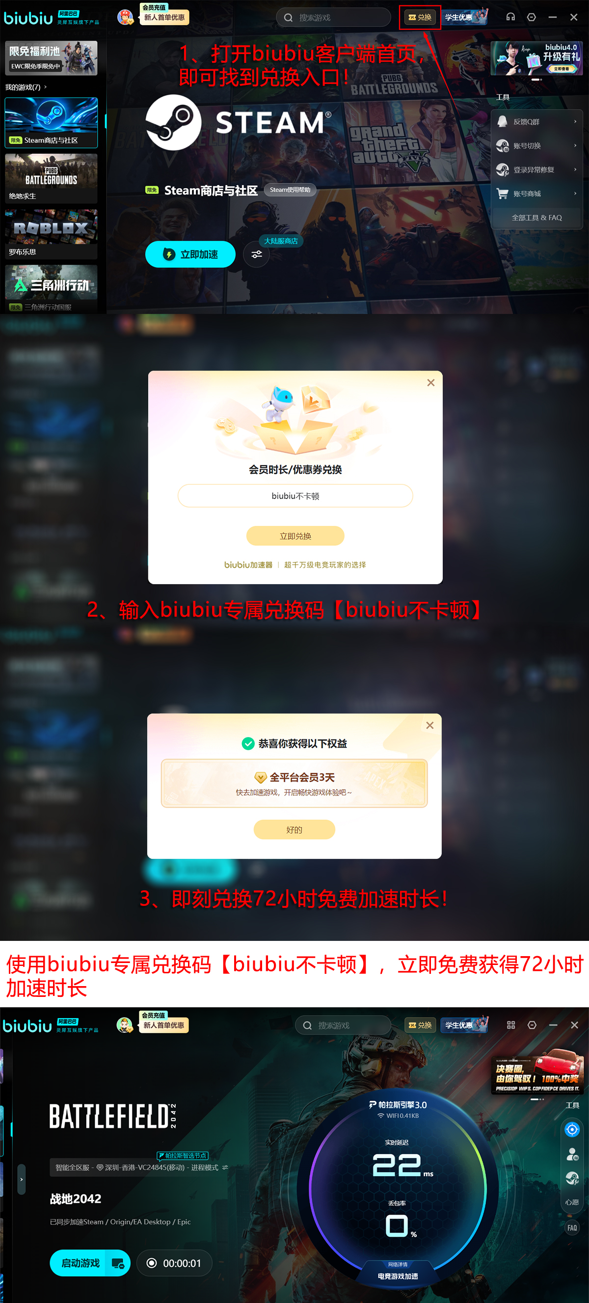 新用户注册后即可即时激活24小时全功能加速权限,用于验证本地网络适配效果。所有用户(含老用户)输入专属兑换码【biubiu不卡顿】,还可额外获赠连续3日加速服务。综合计算,新用户首单权益总计可达96小时免费使用时长,充分覆盖多日高频对战需求。