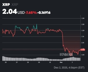 截至发稿时,XRP交易价格为2.04美元,过去24小时内上涨了约1.2%。然而,从周线来看,该资产下跌超过8%。