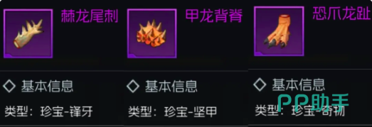 中后期主力合成方案为稀有组合:“棘龙尾刺+甲龙背脊+恐爪龙趾”。该组合提供力量、敏捷、耐力、精神各+40点基础属性,是当前版本最高档位的基础加成。除主属性外,还附带额外战斗特效增益,综合战力提升显著,适用于已解锁高难度副本及竞技场玩法的成熟玩家。
