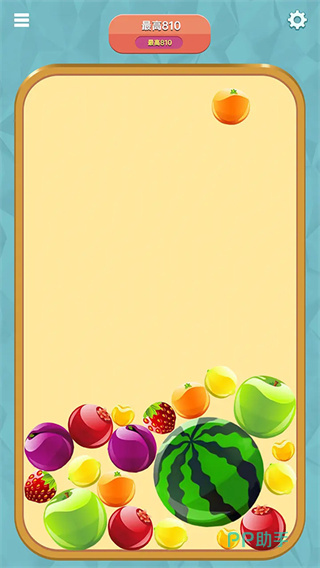 本作共设8种水果类型,每种均拥有专属合成规则,例如提子仅能合成出柠檬。游戏采用竖屏铺陈布局,但通过物理反馈强化沉浸感:水果下落时具备明显弹性,堆叠过程中呈现真实的空间挤压效果;同类水果接触即自动融合,全程无需道具干预,操作简洁而反馈精准。