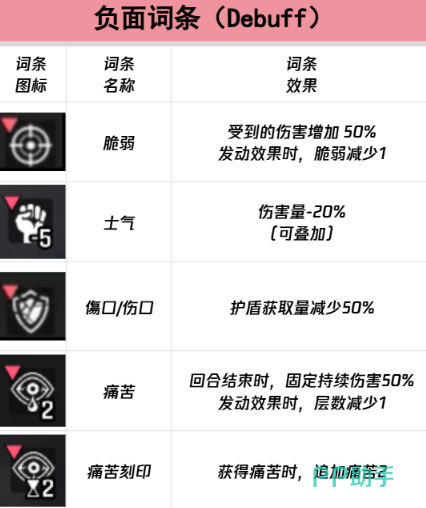 “伤口”是专精于瓦解护盾体系的防御类负面词条。该状态无层数概念,一旦命中即永久生效至回合结束,直接削减角色所获得护盾总量的40%。该效果不可被常规驱散技能清除,仅能通过特定净化类主动技能(如【净蚀之印】)或道具【愈疗绷带】解除。对于以护盾为核心生存逻辑的前排坦克或提供群体护盾的辅助角色,“伤口”将导致其防护效能断崖式下跌——原本可覆盖全队3轮攻击的护盾量,在词条作用下仅能支撑1.5轮,极大压缩团队容错空间,迫使后排输出提前暴露于敌方集火范围内。