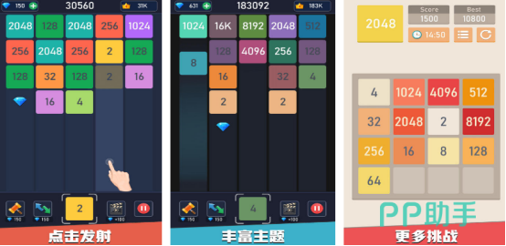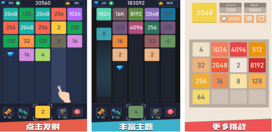 在2048经典框架上实现玩法革新:顶部动态显示目标数字,底部随机生成含数字“2”或其他数值的可发射方块;玩家点击屏幕完成精准投射,使同值方块碰撞合并,生成更高位数。提供6套视觉主题及多样化辅助道具,兼顾操作精度与策略节奏,提升单局可玩性与重开动力。