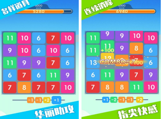 本作采用三消+数字合成双机制,玩家需在网格中滑动并连接三个或以上相同数字,触发合并升级。界面采用高对比度配色与动态粒子反馈,强化消除快感;每轮操作均可累积连击倍率,提升得分效率。核心策略在于预判数字生成位置与预留合成路径,兼顾短期清除与长期布局。