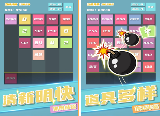 创新融合2048数值叠加逻辑与弹射类物理操作,玩家通过瞄准发射带数字的方块,碰撞相同数值即可相加——从2→4→8……直至达成2048目标。关卡支持道具辅助,如冻结格、方向修正与数值重置,增强容错空间。节奏明快,强调手眼协调与数值预判能力。