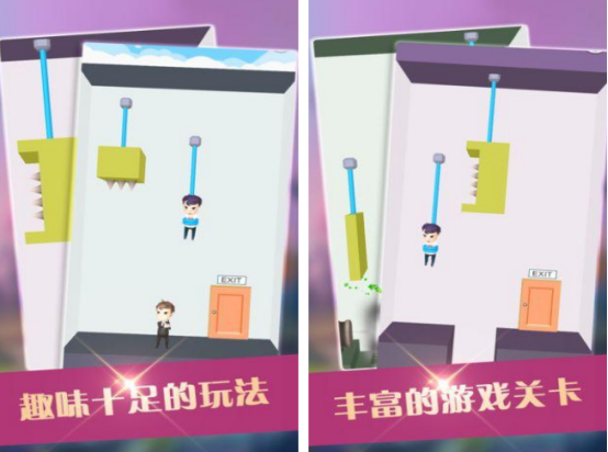 本作基于真实物理引擎打造,以三维视角呈现“割绳逃生”玩法。玩家操控虚拟剪刀,在复杂缠绕的绳索系统中精准切断指定节点,引导婴儿安全滑落至目标平台。关卡内置弹性绳、燃烧绳、冰冻绳等差异化材质,配合重力偏移、风向扰动等环境变量,形成高度拟真的解谜体验。全部500+关卡按难度梯度编排,适配不同水平玩家的进阶需求。