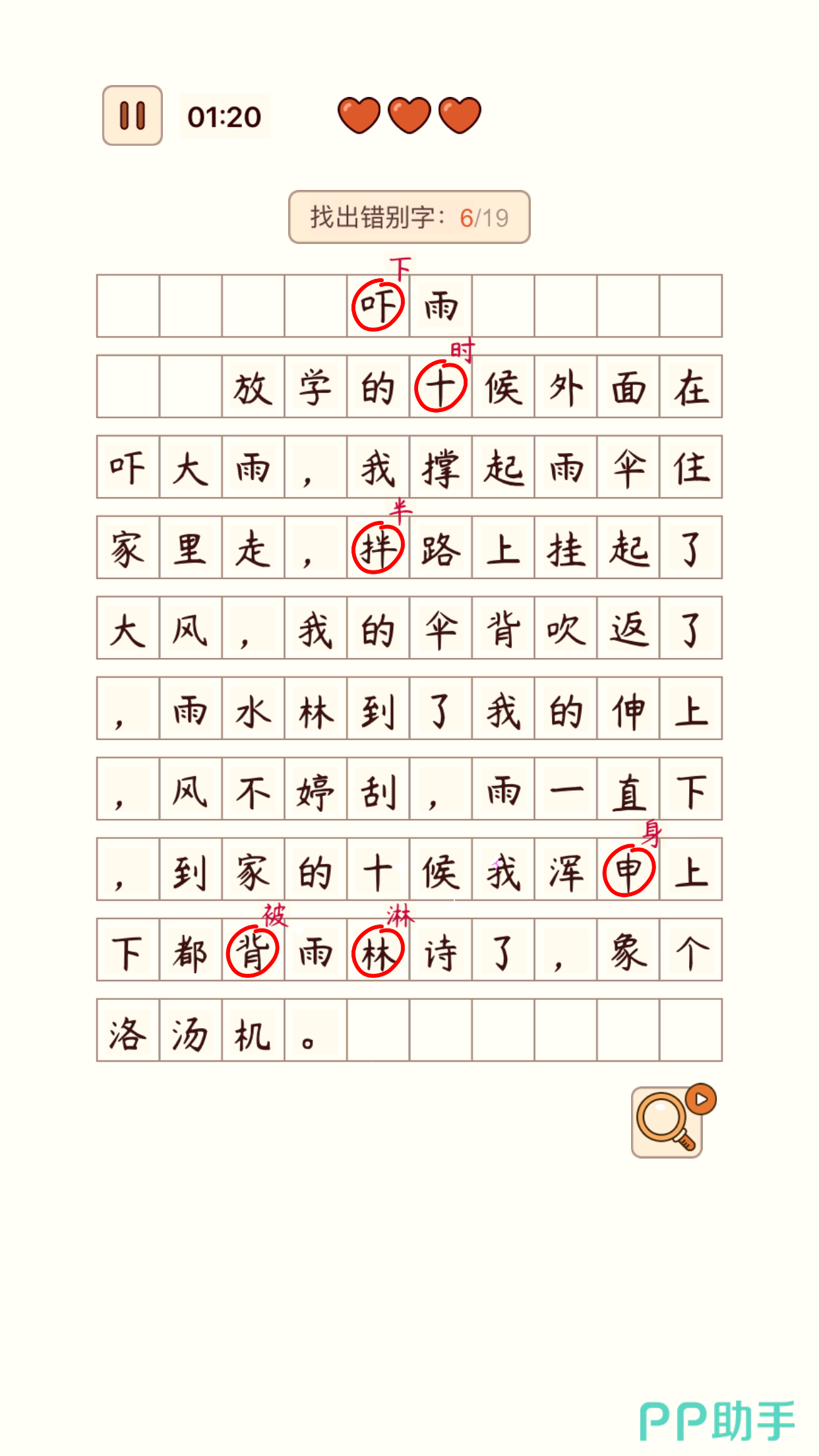 专注汉字形义辨析能力提升,采用双图对比机制呈现高度近似的汉字组合。差异点涵盖笔画增减、部件位移、偏旁变形等微观层级,限时内找出全部不同项即可通关。每次识别成功后自动显示该字的标准读音、部首归类、常见组词及易混字对照,强化汉字结构意识与书写规范性认知。