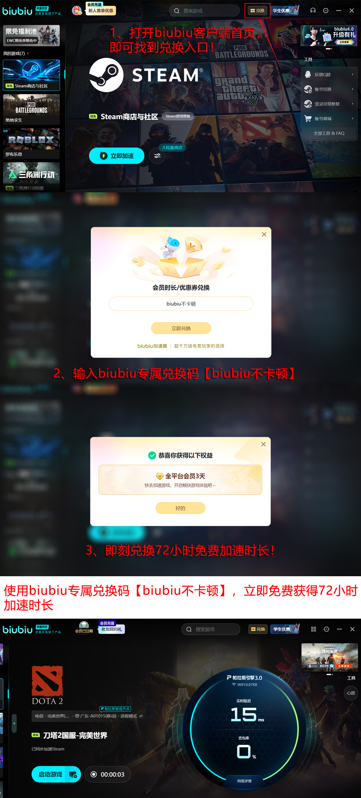 首次使用的用户可领取24小时全功能试用权限,完整体验低延迟加速效果。所有用户(含已注册账号)输入兑换码【biubiu不卡顿】,即可额外激活72小时加速服务,覆盖至少3–5场天梯对局周期,助力玩家在关键排位阶段保持操作一致性与团队协同效率。