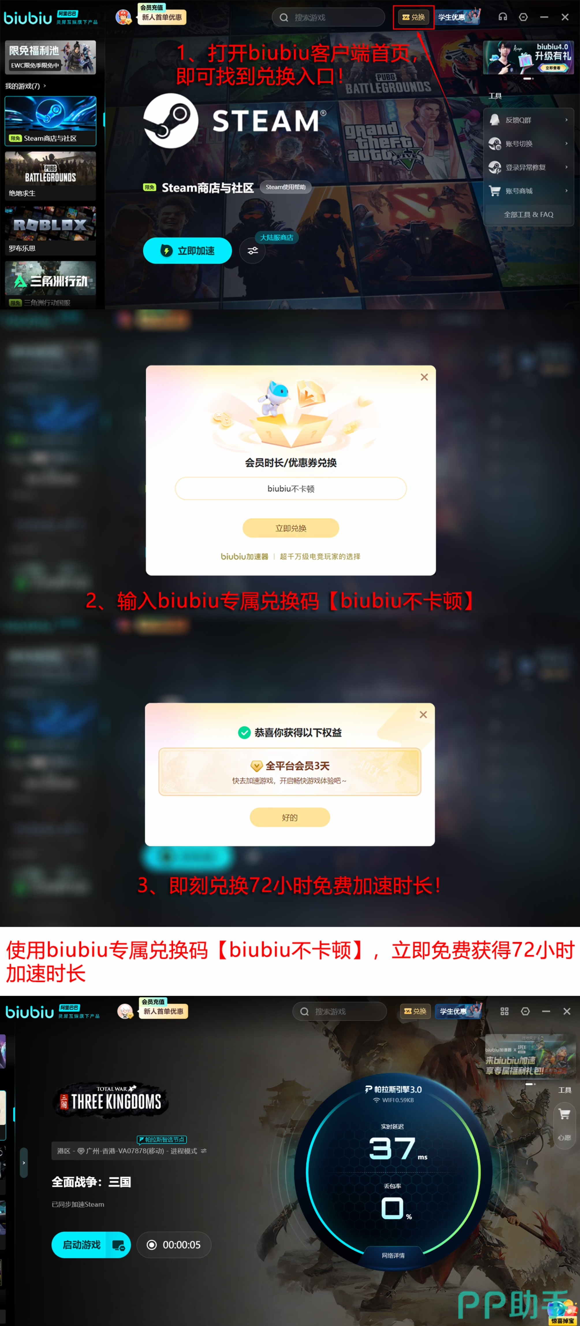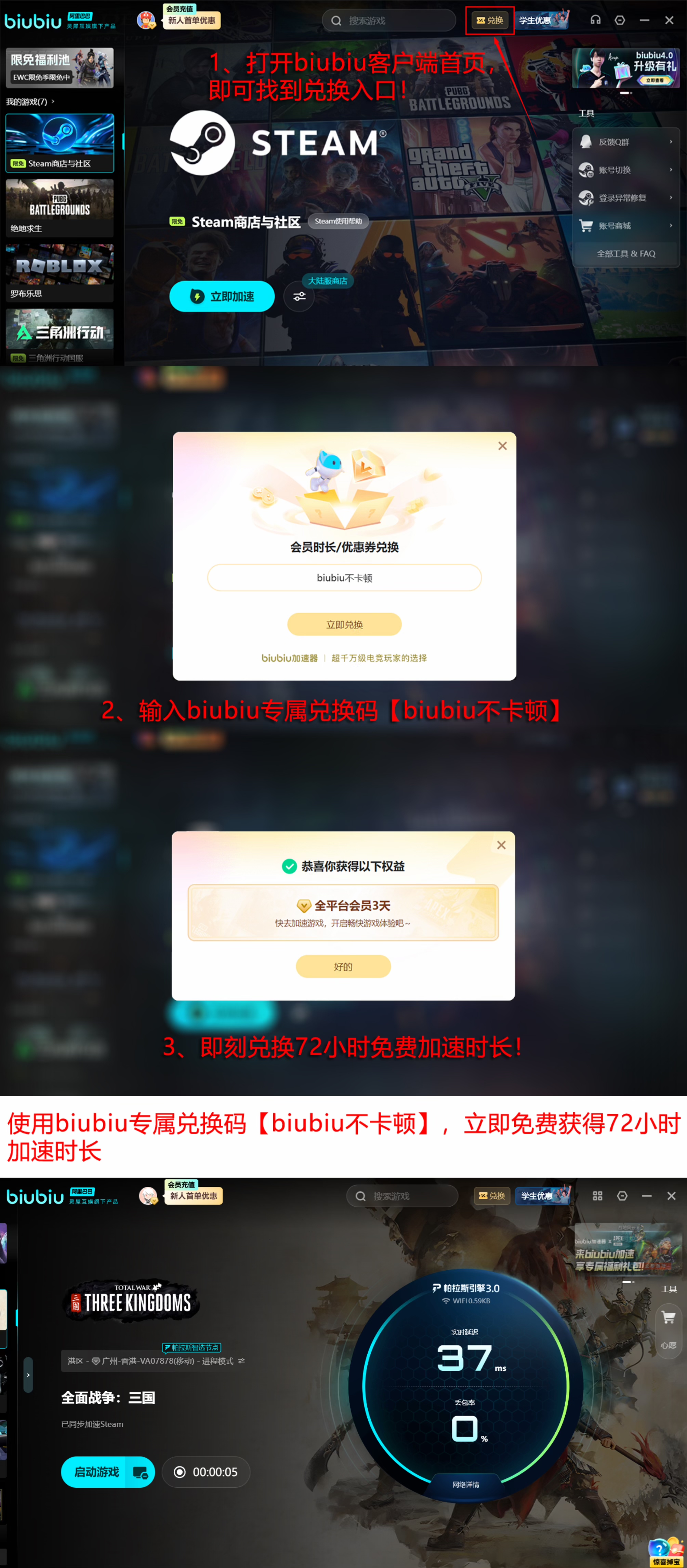 为便于用户验证实际效果,biubiu提供新用户专属24小时免费加速时长;另设通用福利兑换码【biubiu不卡顿】,所有用户均可领取3天加速权限。新注册用户完成双重领取后,最高可享96小时无限制体验,充分覆盖多局战役周期,真实感知加速前后运行稳定性差异。