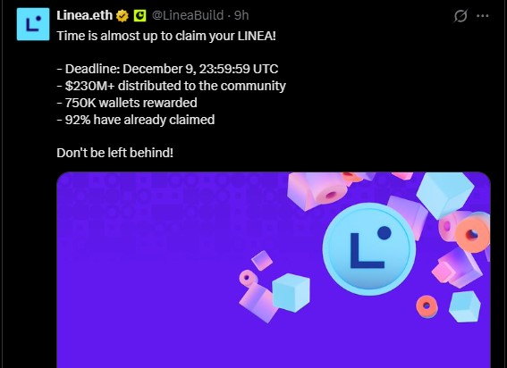 Linea 空投领取截止日期临近:仅剩最后几个小时