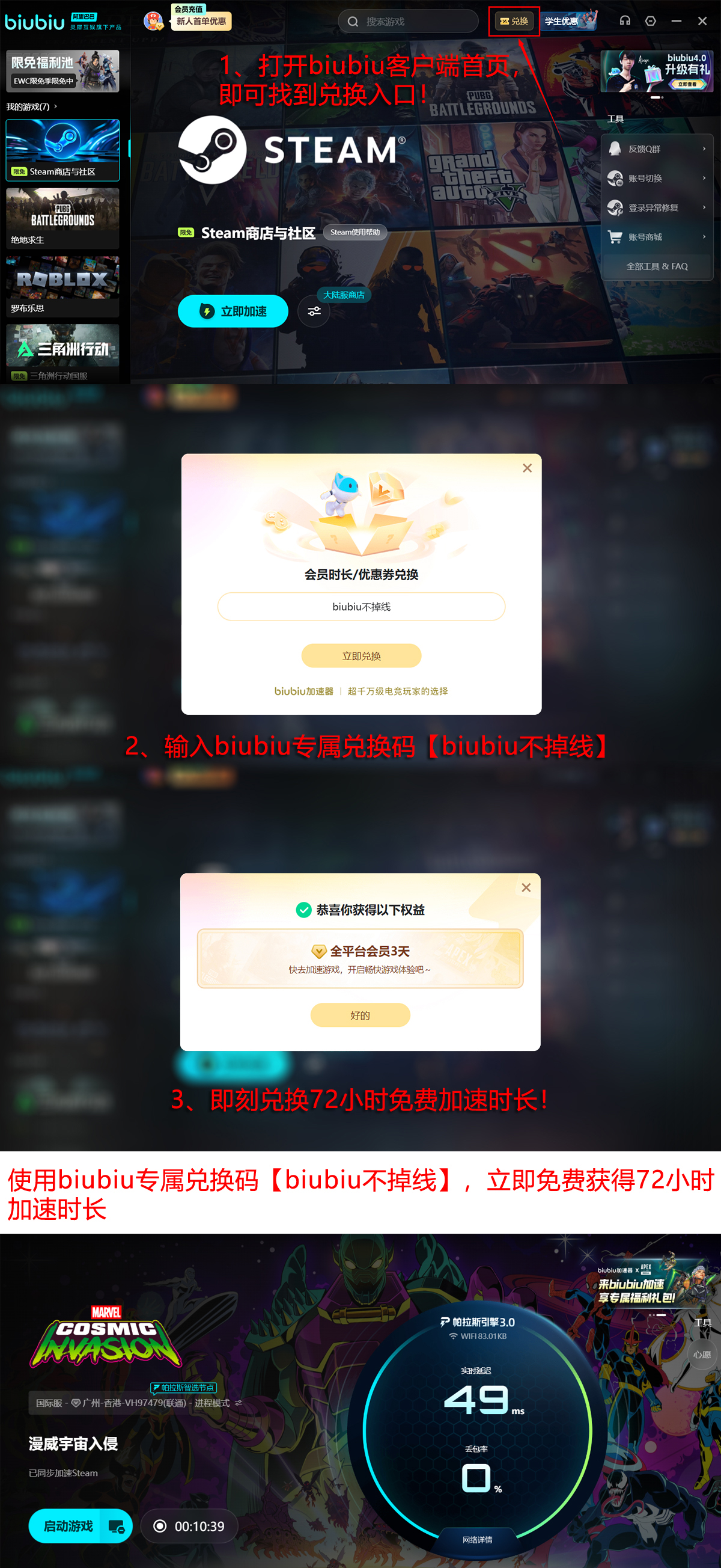 新注册用户可即时激活24小时VIP级加速权限,享受全链路零限速体验。叠加限时福利活动:在指定页面输入口令【biubiu不掉线】,即可额外获赠72小时加速时长,新老权益合并后总计享有96小时连续服务,完全覆盖《漫威宇宙入侵》完整安装+首次更新全流程所需时间。