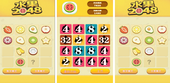 提供双模式自由切换:数字模式还原传统2048滑动合成逻辑,玩家通过方向操作将同值方块归并升阶;水果模式则以拟物化设计呈现,猕猴桃、香蕉等水果图示替代数字,逐级合成至终极目标“大西瓜”。两种模式共享底层数值演算规则,满足不同审美偏好与认知习惯。