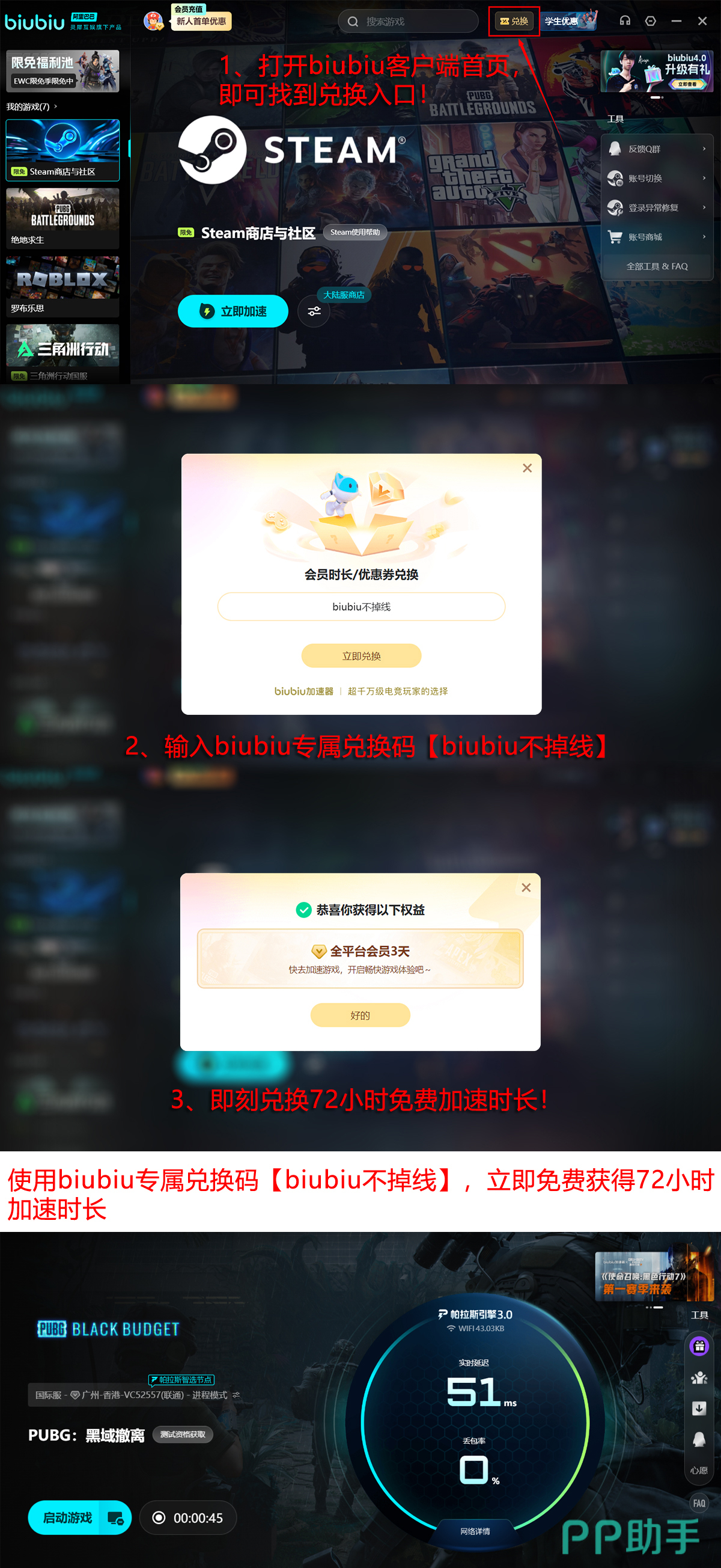 针对闪退顽疾与连接不稳问题,biubiu加速器提供端到端解决方案。新用户注册即赠24小时VIP加速权限,激活时输入专属兑换码【biubiu不掉线】,可额外获得72小时连续加速服务。双重权益叠加,总计享96小时免费加速时长,助力玩家全程无忧接入服务器。