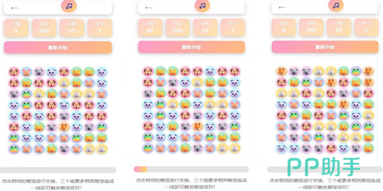 融合经典三消机制与萌系画风,相邻两个动物图标可通过点击交换位置触发三连及以上消除。消除组合越复杂,连锁反应越强,分数加成越显著。界面无冗余元素,操作仅需单指触控,适配碎片化场景,通勤、候车时轻松上手。