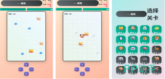 以拟人化动物为主角展开轻策略闯关,狮子、柴犬、雪貂等十余种角色轮番登场。每关设定明确目标:收集指定数量的食物(如骨头、鲜鱼、浆果),通过屏幕下方方向键操控角色移动。关卡背景随主题切换,从草原营地到雪山小屋,视觉节奏明快,操作响应精准。