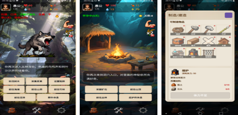 取材自经典寓言精神内核,玩家扮演世代扎根海岛的开拓者。初期聚焦个体维生,中期解锁“子母河”地理线索并迎来后代角色,实现多代协同建设。营地发展呈线性成长路径:从简陋草棚到功能分区营地,最终集齐造船组件打造远航方舟。游戏将家族传承、资源代际积累与长期目标管理融为一体。