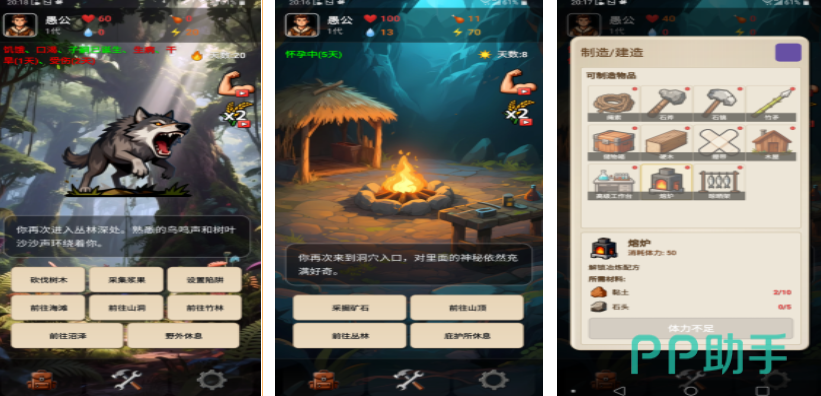 采用日记体叙事框架,玩家在失事后需逐日记录生存状态。岛屿生态系统具备完整食物链,野生动物行为受天气、时间与玩家活动影响。资源分布高度随机,要求玩家建立动态采集路线;工具制作需匹配特定场景需求,如鱼叉适用于浅滩捕捞,陷阱更适合林区设伏。生存压力贯穿始终,但成长曲线清晰可控。