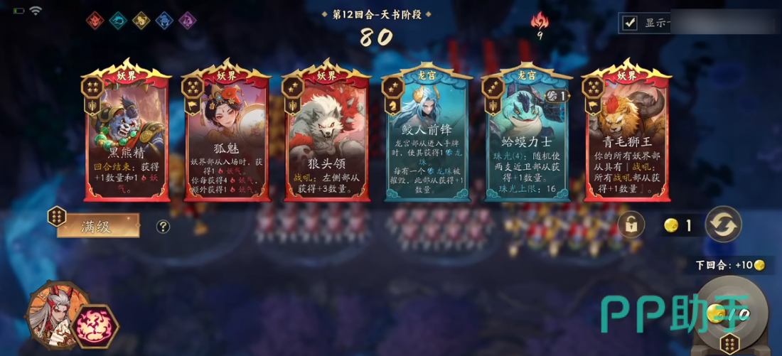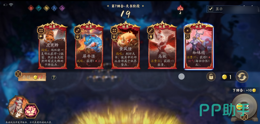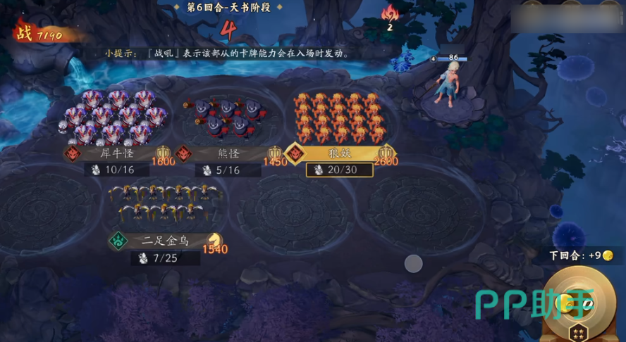 接下来就是最为关键的战局后期了,这个时候不仅要加大攻击力度同时还要兼顾经济,在卡牌上最好有【雷鸟怪】、【羽翼天魔】、【金翅大鹏】、【九尾天狐】。雷鸟怪增加队伍的攻击能力,卡牌越多越好;羽翼天魔是妖族刷经济的主力,在后期经济能力越强升级越快;金翅大鹏和九尾结合起来一起用,金翅是消费倍率卡,九尾能提高消费带来的收益,九尾还有一定的助战能力。