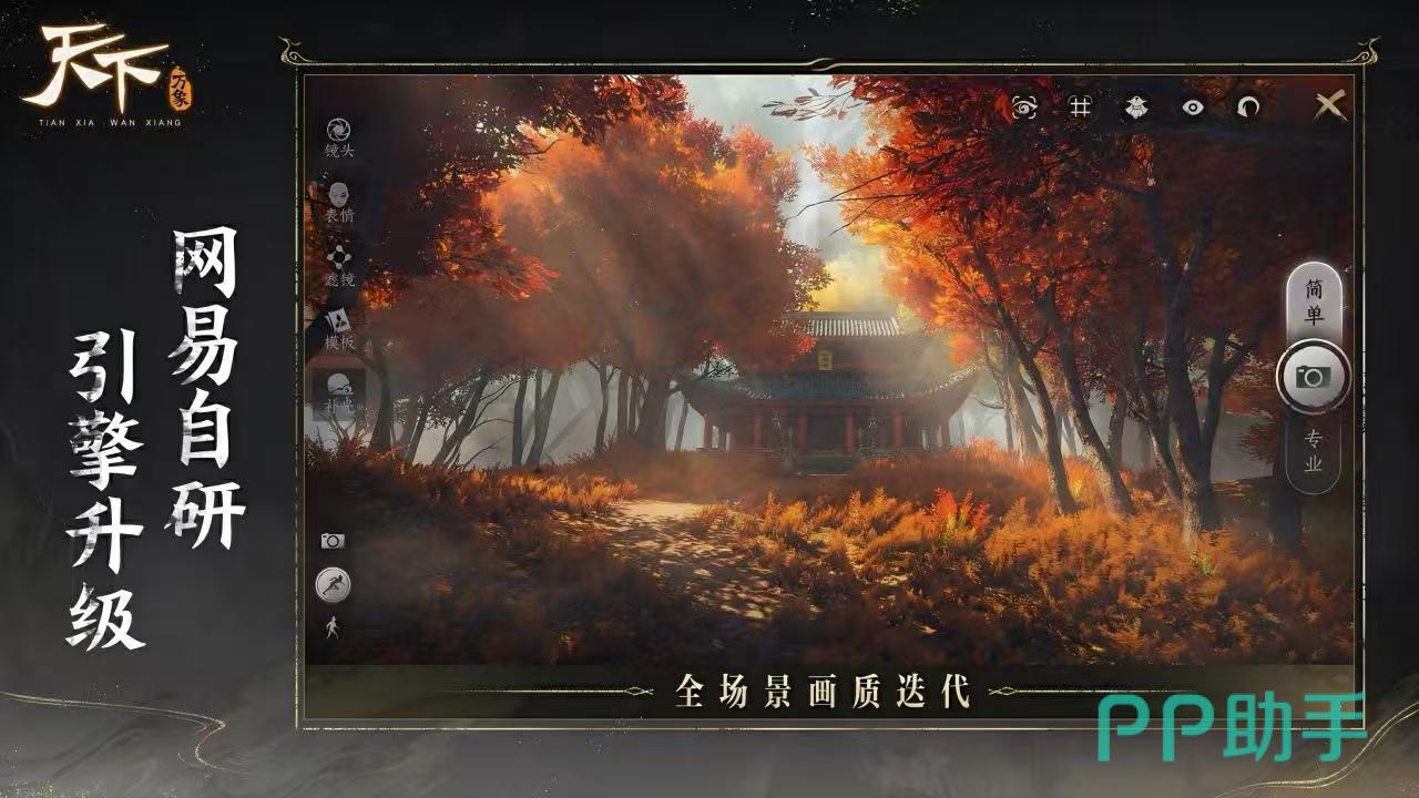 天下万象是由网易首款3DMMO端游天下升级而来,采用了网易自主研发的全平台引擎弥赛亚,设计了三端互通的模式,方便玩家在碎片化时间体验精彩的游戏世界。在这款游戏中,玩家不仅可以体验到角色数据三端互通的便捷,模型方面也进行了迭代更新,对于大荒全场景制造方面,也营造出了更细腻的光照氛围,即使在多人同屏对战下,也能够做到不卡顿,达到了世界级的战斗体验。