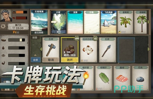 故事始于一架客机坠毁于环礁包围的孤岛,主角苏醒时仅有标准急救包一套。开放性伤口需在三小时内完成清创与包扎,否则引发感染导致状态持续恶化。资源获取依赖场景交互:撬开货舱残骸获得金属件,蒸馏海水获取淡水,烘烤海藻补充微量元素。角色成长采用技能树+卡牌双轨制,生存行为(如生火、净水、制绳)均以功能卡牌形式呈现,卡组构筑直接影响操作成功率与资源转化效率。