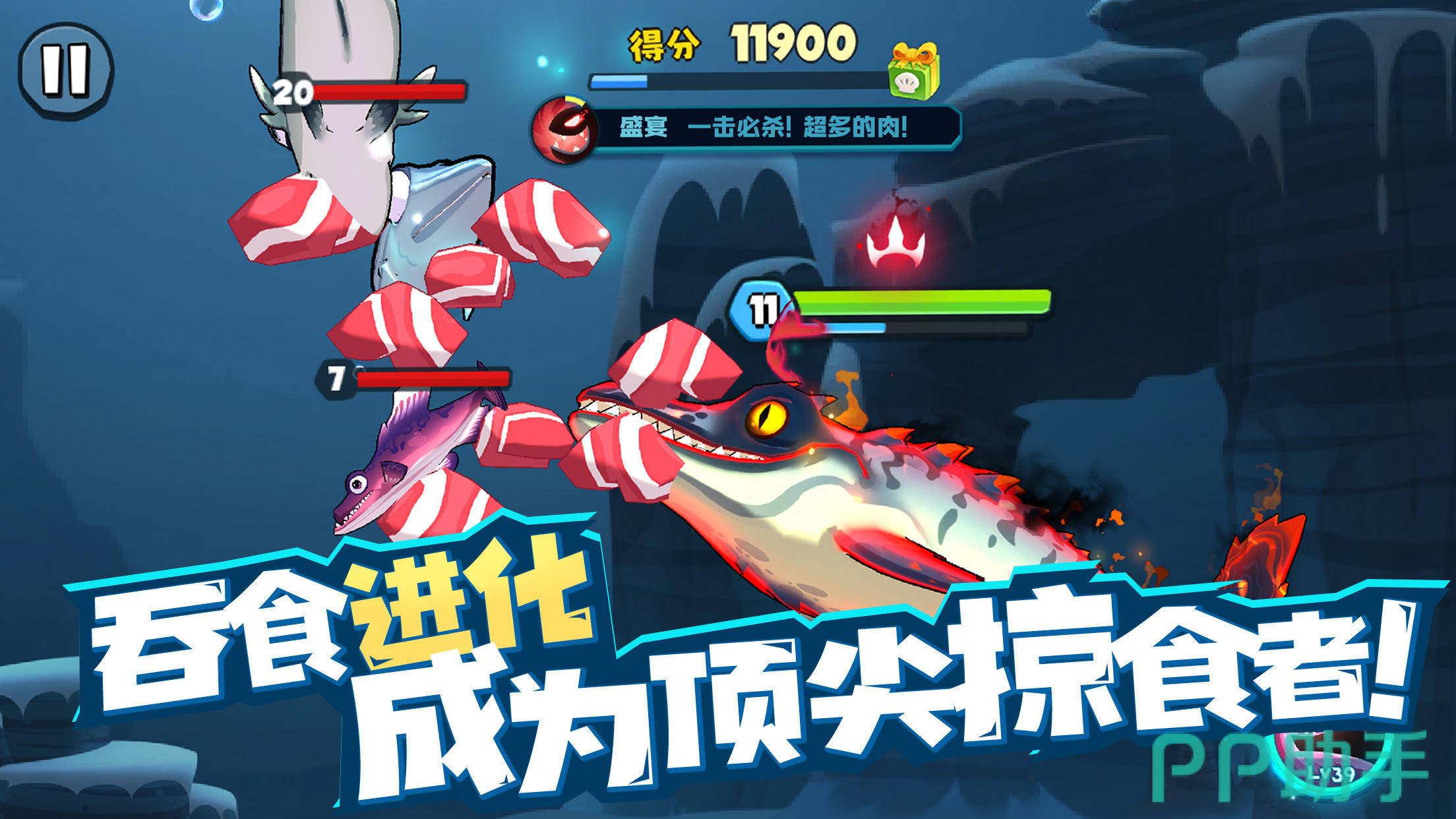玩家从幼年鲨鱼起步,通过持续摄食各类海洋生物(含鱼类、海豚及潜水员)积累进化点数,解锁更大体型、更强咬合力与专属技能。游戏采用多层海域地图设计,不同区域分布差异化生态群落与隐藏威胁,推动玩家主动探索未知水域。进化系统深度绑定生存表现,每一次形态跃迁均直接影响战术选择空间与环境适应能力。