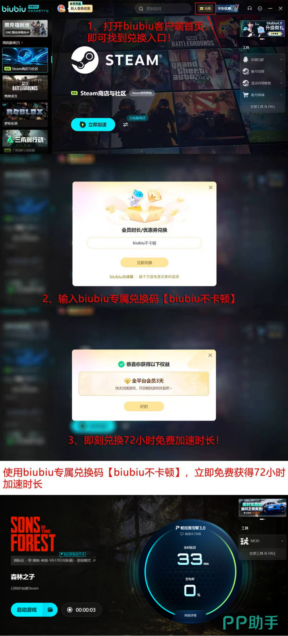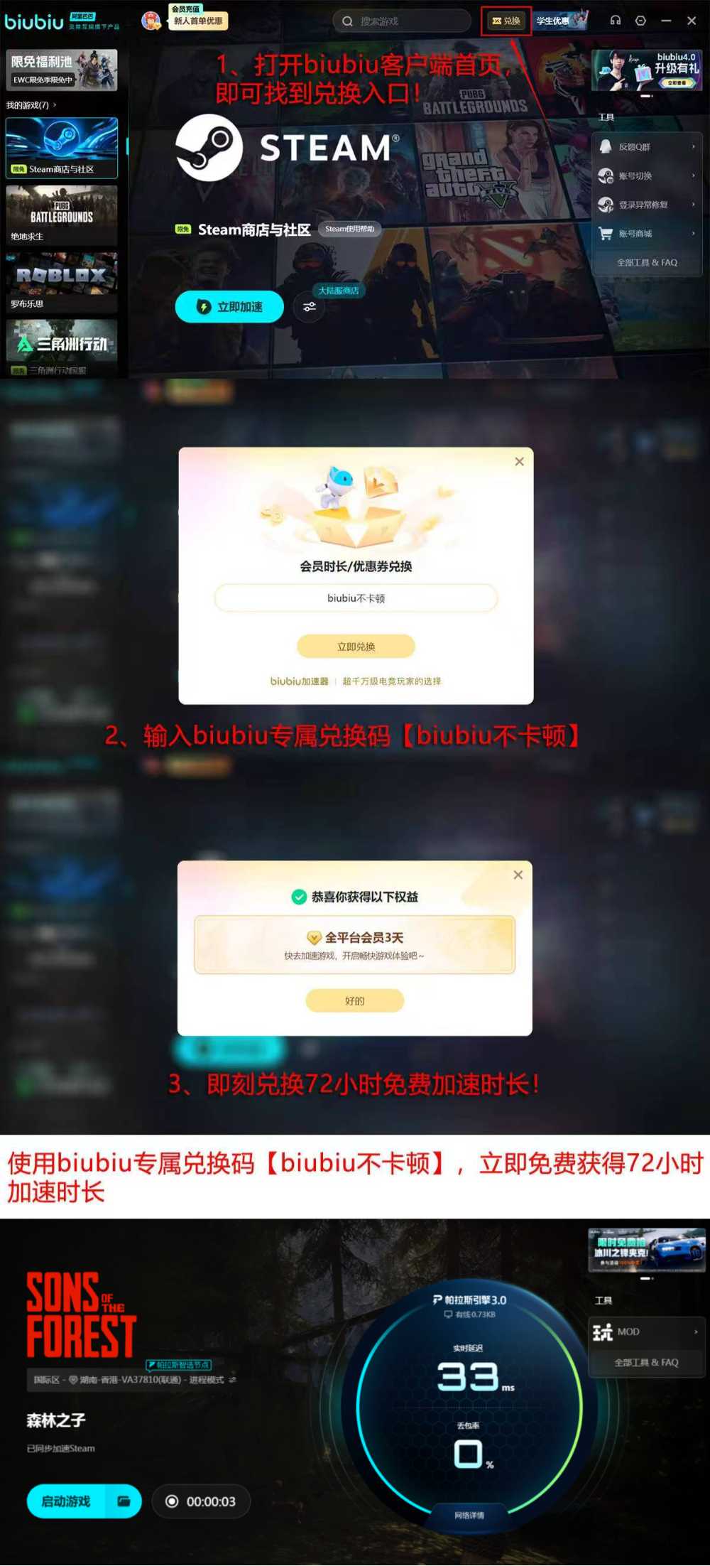 实际效果优于理论描述,新用户注册后即可获得24小时全功能免费试用权限,零门槛验证加速实效。此外,输入专属兑换码【biubiu不卡顿】,还可额外领取72小时加速时长,累计达96小时免费体验期。相较同类产品普遍设置5–10分钟限时试用、绑定手机号或完成任务才开放基础功能等限制,biubiu加速器在用户体验与权益透明度上更具诚意。