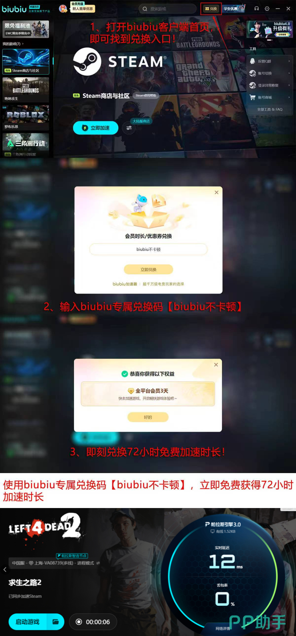 对于新用户,biubiu加速器提供零门槛试用方案:完成首次注册后,无需完成任务或邀请好友,即可直接领取24小时免费加速时长,足够完整通关数个高难度战役章节,直观感受网络优化效果。此外,输入专属兑换码【biubiu不卡顿】,还可额外获得72小时加速权限,总计享有多达4天的全功能体验期。无论是短期联机需求,还是长期稳定使用,该福利均能实现低成本高效接入。