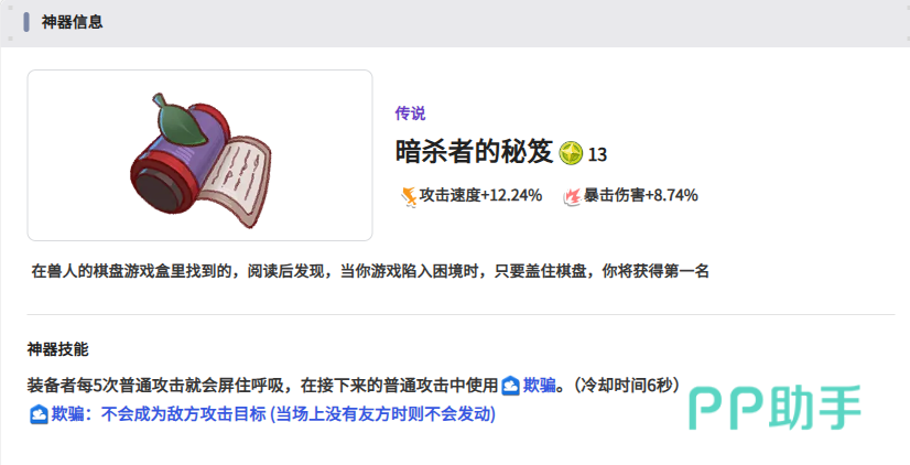 暗杀者的秘籍也很不错,也有一定的攻速提升效果,不过在暴击伤害这方面有一定的加成,所以装配的装备在攻击的时候,如果次数达到5次,那么会拥有一次欺骗效果施加给敌人。