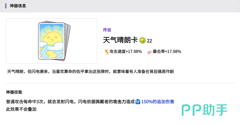 天气晴朗卡也是可以带来攻速和暴击方面的加成,如果大家攻击中三次的话,那么还可以得到一个闪电发射效果,拥有最佳攻击能力。