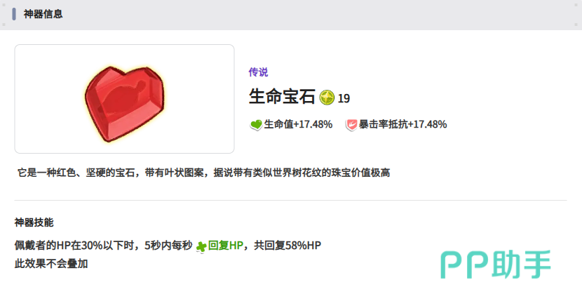生命宝石可以提升生命数值方面的效果,而且还有一定额外的暴击抵抗能力,如果大家本身装备的属性不错,那么角色在自身的血条能量小于30%的时候,还有一定的恢复能力,不过只有神器触发时间内才可以用。