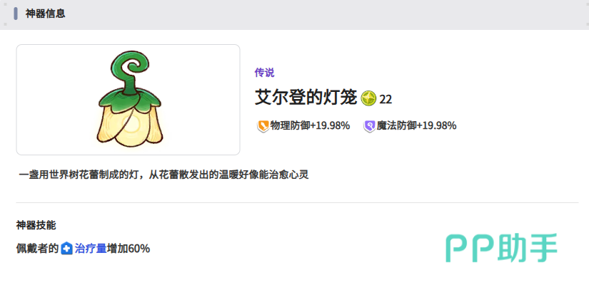 艾尔登的灯笼很适合用于前排角色身上,拥有不错的物理防御效果,魔法防御也有一定加成,还有一定的治疗能力,让小伙伴们可以回一定的血量。