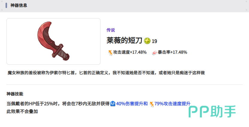 莱薇的短刀可以提升公诉方面,此外还能给角色的暴击属性带来数值加成,值得一提的是只要在血量低于25%的时候就会增添无敌效果,且持续好几秒,在这个状态下,大家的角色伤害都会提升40%,攻速最高可以提升达到79%。