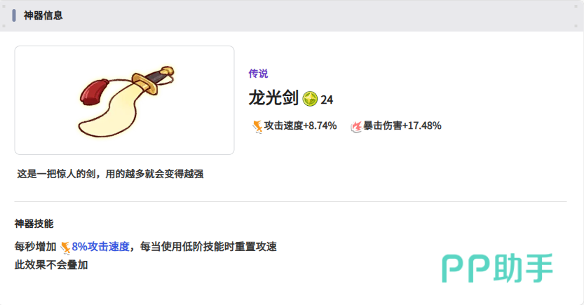 首先第一个推荐的就是龙光剑,可以给攻击角色使用,可以提升攻速和暴击方面的属性加成,在攻击敌人之后可以提升个人的攻速。