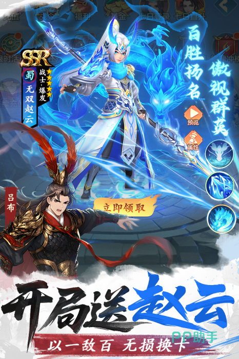 游戏开局就会赠送众多的名将,例如惯例可以领取的赵云诸葛和二爷等武将,能让各位最快的速度组建自己的开荒战队,所以游戏前期的开荒难度非常的低,游玩的乐趣也是非常的高,大家氪金的需求也少,完全可以作为副游戏来游玩。
