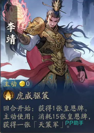 李靖的阵容比较难成型,所以使用需要依靠大家的运营能力,他的被动能在回合开始时获得一张皇恩牌,皇恩牌属于帝国专属道具,帝国部从的强化都需要它,主动使用的时候他会消耗15张皇恩牌来获得天策军,让队伍有着强大的战力。