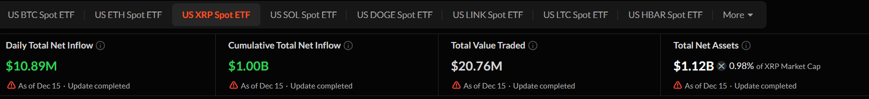 XRP ETF 净流入资金终于突破 10 亿美元大关