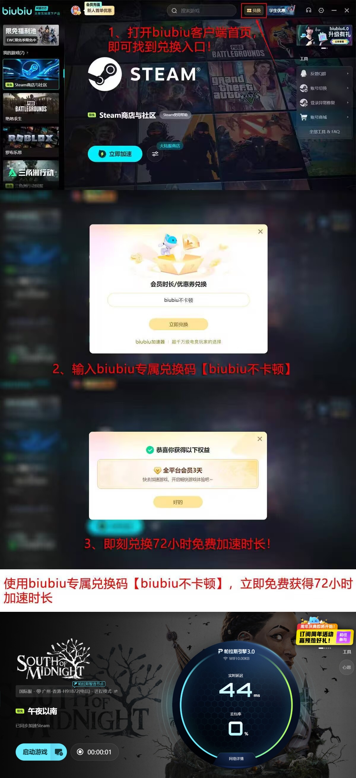 为帮助新用户快速建立使用习惯,biubiu提供分层式体验支持:完成注册并首次登录后,系统自动发放24小时免费加速时长;在激活页输入通用兑换码【biubiu不卡顿】,即可额外领取3天高级会员权限。两项权益叠加可达近百小时试用周期,充分覆盖新手适应期。此外,学生群体凭学信网认证信息,还可享受专属会员价格优惠。