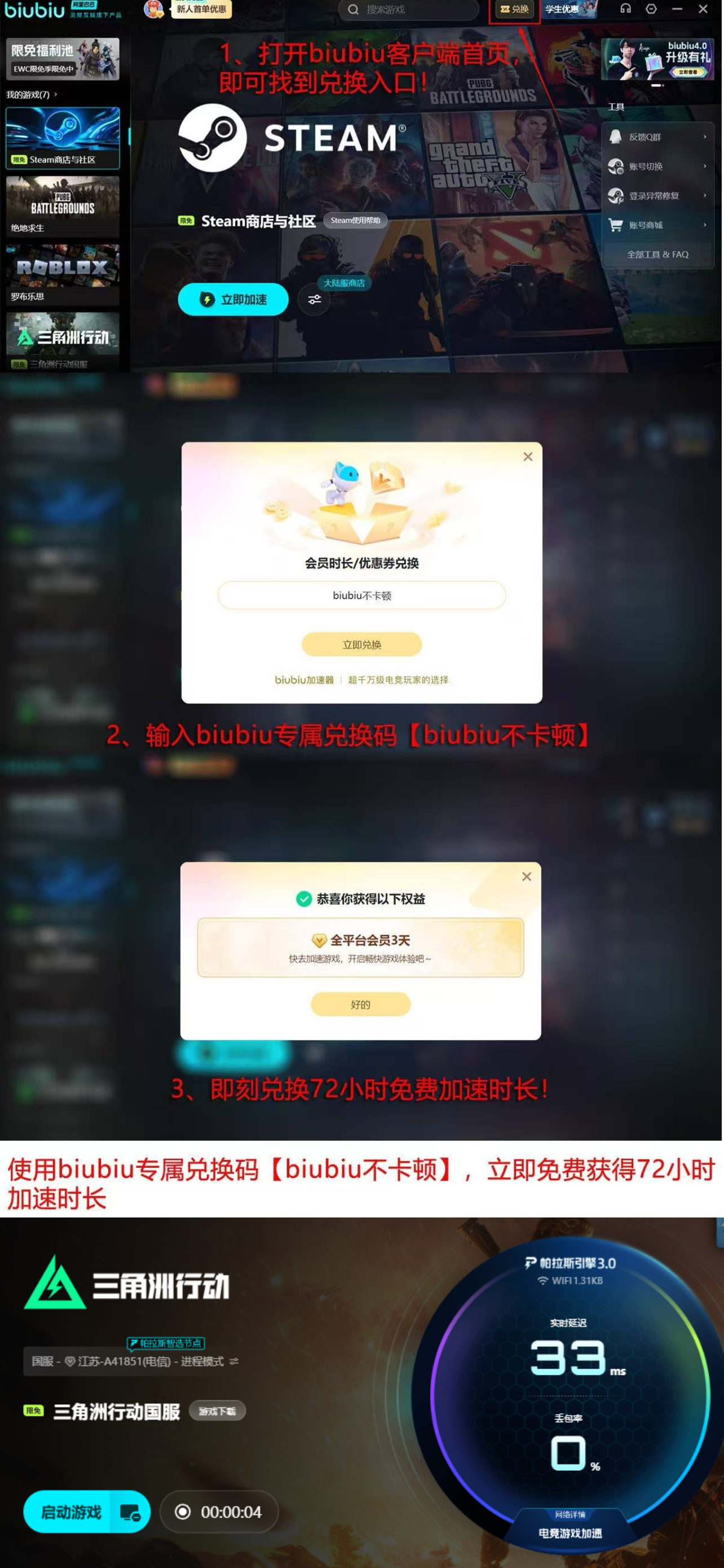 操作流程简洁高效:用户仅需在加速器主界面搜索“三角洲”,选择对应服务器区域(国服/国际服),点击启用即可完成全链路优化。系统将自动完成路由优选、协议适配与带宽预留,全程零手动配置。新用户注册后可直接获得24小时全功能试用权限;若体验满意,可在客户端首页输入兑换码【biubiu不卡顿】额外领取72小时加速时长,无需付费激活。