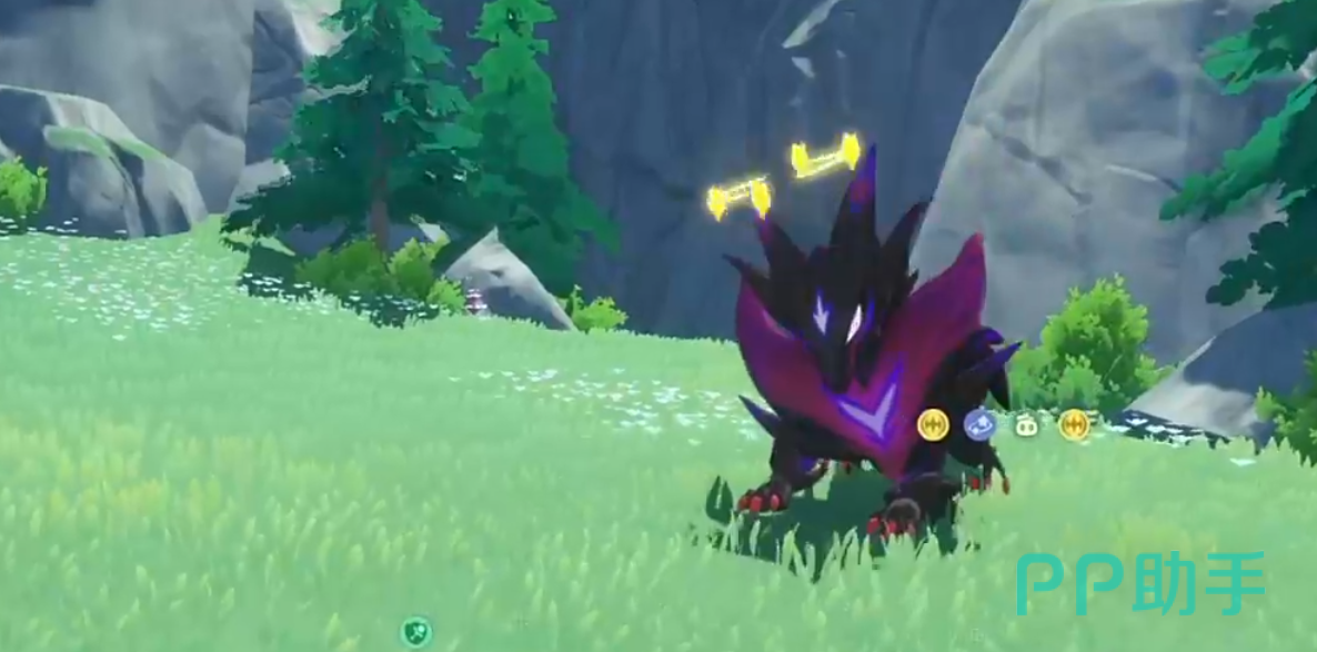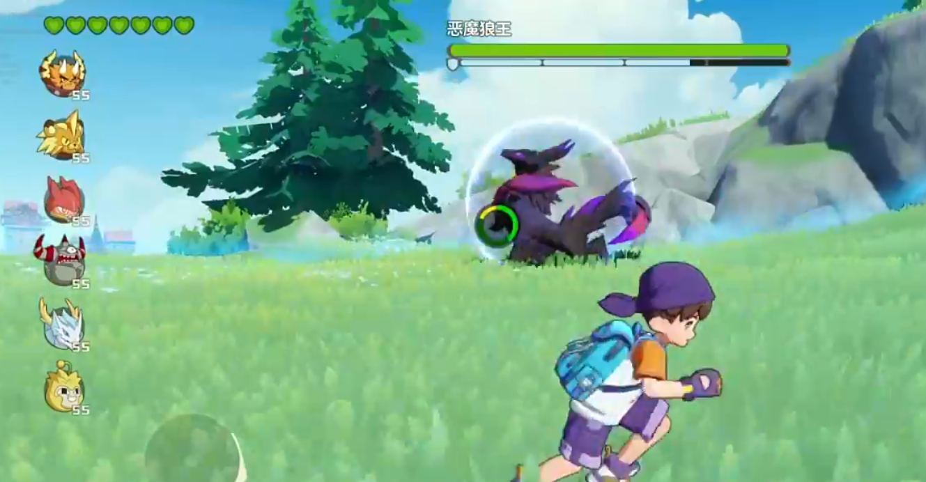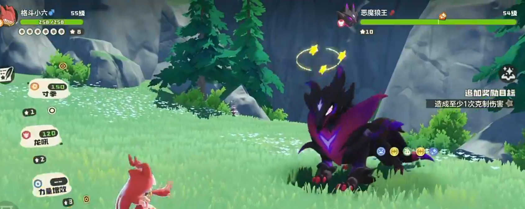 由于此招速度很快,所以大家如果突然发现其消失,就要迅速转动视角观察好敌人出现的方位,利用冲刺来进行躲避并趁机蓄力攻击,就会进入到二阶段的精灵对战,在二阶段中,由于恶魔狼王是恶系的,所以推荐能克制的光、武、虫属性精灵上场。