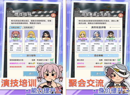 作为国内较早上线的全维度艺人模拟养成手游,《明星梦工厂》支持双性别艺人培养体系——既可打造高颜值、强业务能力的超级女星,也可孵化实力派男星。游戏深度还原选角试镜、综艺曝光、影视接洽、粉丝运营等关键环节,内置数百位风格各异的初始艺人模型,涵盖清纯、飒爽、复古、国风等多种审美取向。玩家通过课程训练、造型升级、资源投放等方式提升艺人综合指数,逐步解锁顶级代言与红毯资格。