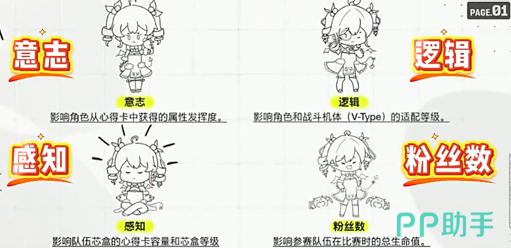 装备养成方面,角色战力提升依赖于四大核心属性:意志影响技能稳定性,感知决定武器效能(等效于攻击系统),逻辑关联技能冷却与判定精度,粉丝数则直接挂钩角色初始生命值。其中,感知为关键成长维度,粉丝数亦不可低于基础阈值。所有装备须通过“芯盒”进行收纳与编配——该容器提供多个嵌入槽位,支持玩家将心得卡按需求装配。心得卡分为三类:属性强化型、技能触发型、特性强化型,分别对应上述四维属性。若聚焦专属技能释放效率,应优先获取技能触发类心得卡。