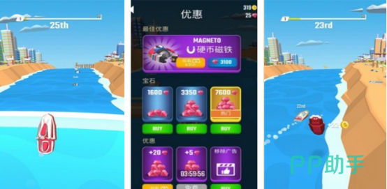 主打极简操作逻辑与高自由度竞速体验。提供单人闯关、计时挑战与观战模式三种玩法入口。所有赛道均基于真实海洋地貌建模,涵盖浅湾、峡湾与公海等多样化水体环境。基础操作仅需点击加速,结合智能路径提示与自适应避障机制,降低上手门槛,同时保留高速过弯与浪尖腾跃的核心爽感。