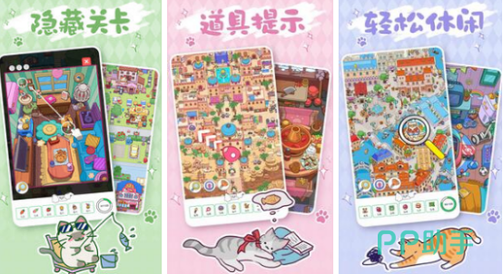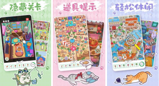 沉浸式猫咪主题寻物解谜游戏,构建出一个色彩明丽、节奏舒缓的幻想世界。场景涵盖阳光海岸线、珊瑚礁小镇、云朵甜品屋等十余种原创美术设定,所有界面均融入拟人化猫角色与生活化小物件。玩法融合静态图像搜索、线索逻辑串联、道具组合使用及物理反馈触发机制,例如拖动遮挡物显露隐藏入口、点击特定物品引发连锁动画效果,兼顾眼力考验与轻度脑力挑战。