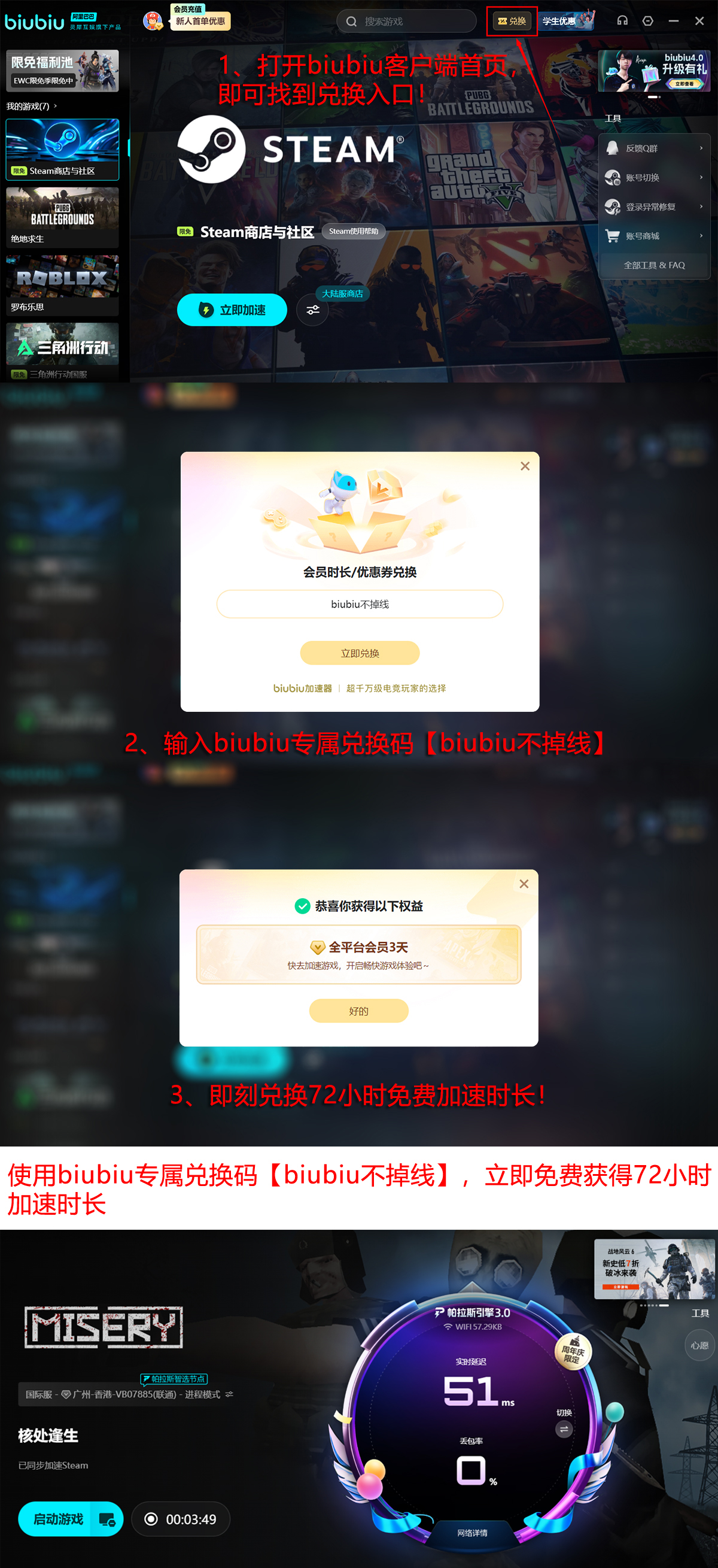 为配合Steam冬促节点,biubiu加速器推出限时福利:2025年12月18日至2026年1月18日期间,开放多款热门游戏的免费加速服务。Steam与Epic平台用户均可参与。活动期间,在客户端内搜索关键词【biubiu不掉线】,即可领取72小时加速时长;新注册用户额外获赠24小时基础权益,两项叠加最高可享96小时连续使用权限。