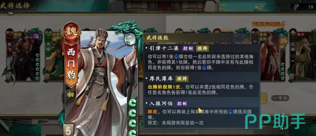 魏国武将西门豹擅长牌序调控与全局重置。“入报河伯”为其唯一技能:可将所有角色的弃牌区牌张及场上所有角色的手牌(含自己)洗入牌堆,实现资源再分配与局势重构,常用于打破僵局或应对关键卡牌缺失困境。