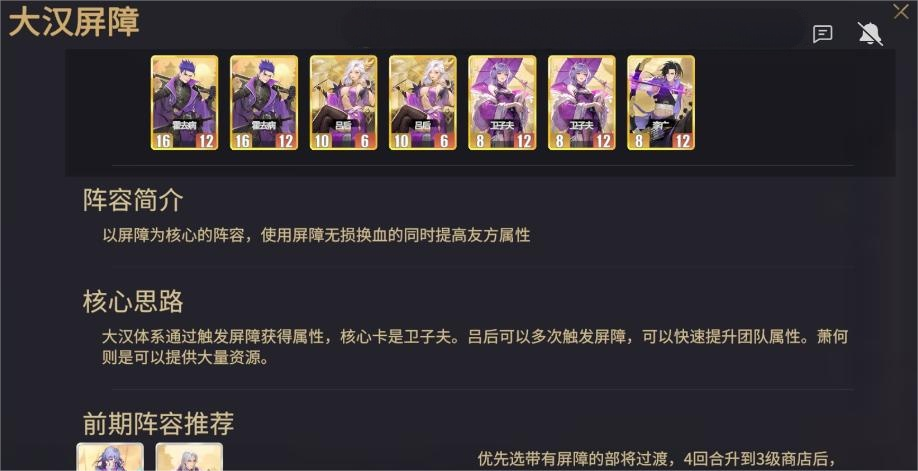 能够以屏障为核心的阵容,可以换血无伤同时提升友方的属性,核心卡卫子夫不是很好搞到,其他都是非常容易获取的,卡牌,吕后可以多次触发屏障可以快速提升团队的属性,萧何则是可以提供大量的资源。