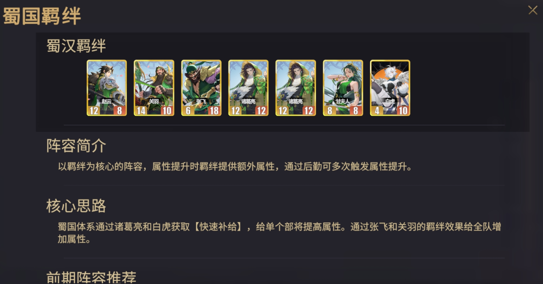 蜀国的羁绊体系中几个角色都是非常的强大的,因为蜀国的角色都是超级身板的角色,所以强度非常的硬,并且有输出又有伤害,对于众多的玩家来说强度非常可观,该羁绊的核心是提供额外的属性,通过后勤可以多次触发属性的提升,诸葛亮和白虎可以快速获取补给,然后为单个的武将提高属性。通过张飞和关羽的羁绊效果给全队增加属性。