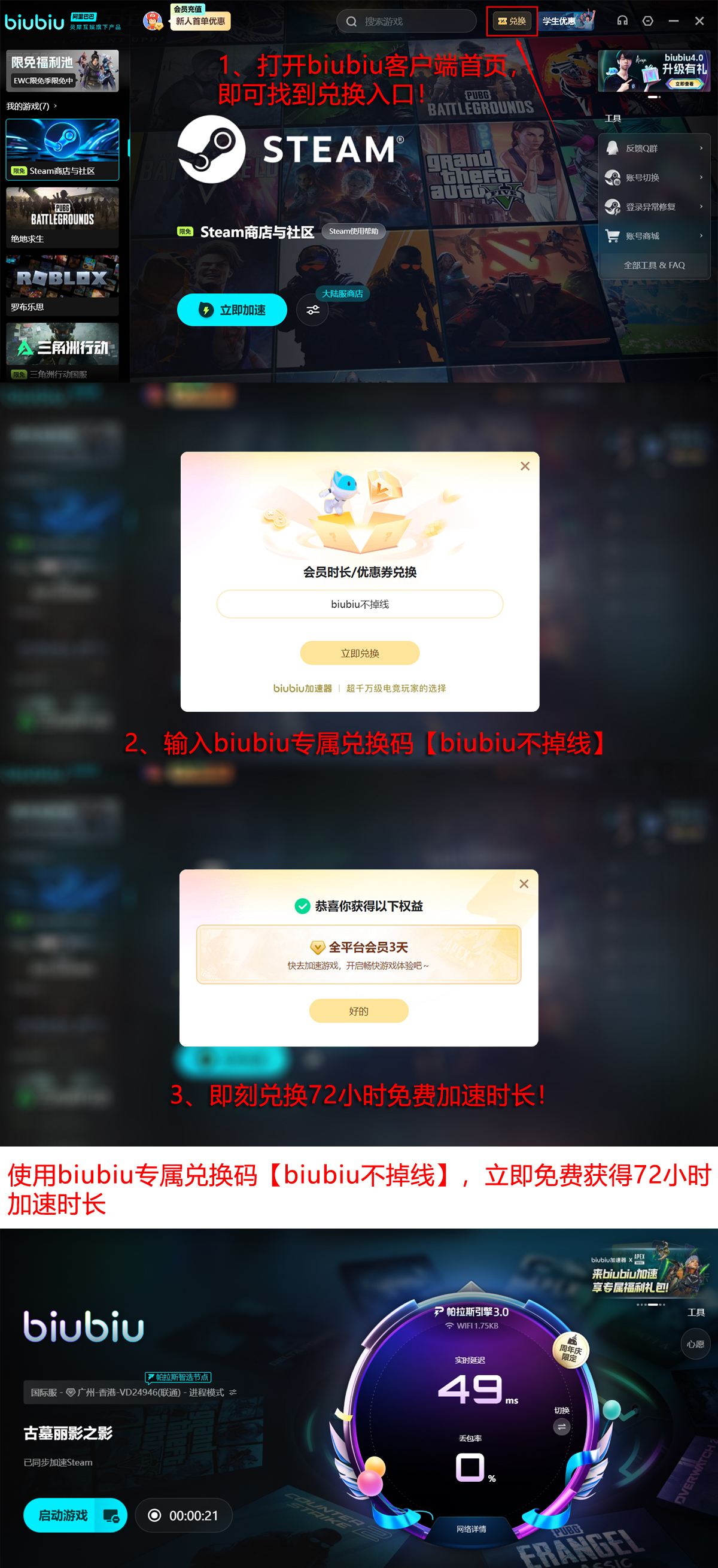 12月18日-1月18日biubiu平台推出大量营销活动:在此期间,用户可在限时免费加速池中解锁热门加速节点的无限制使用权,无需开通会员即可启用高速下载通道。新注册用户首次登录即赠24小时全功能试用权限,叠加参与【biubiu不掉线】活动还可额外获得72小时连续加速权益,合计可享四天免门槛极速下载服务。