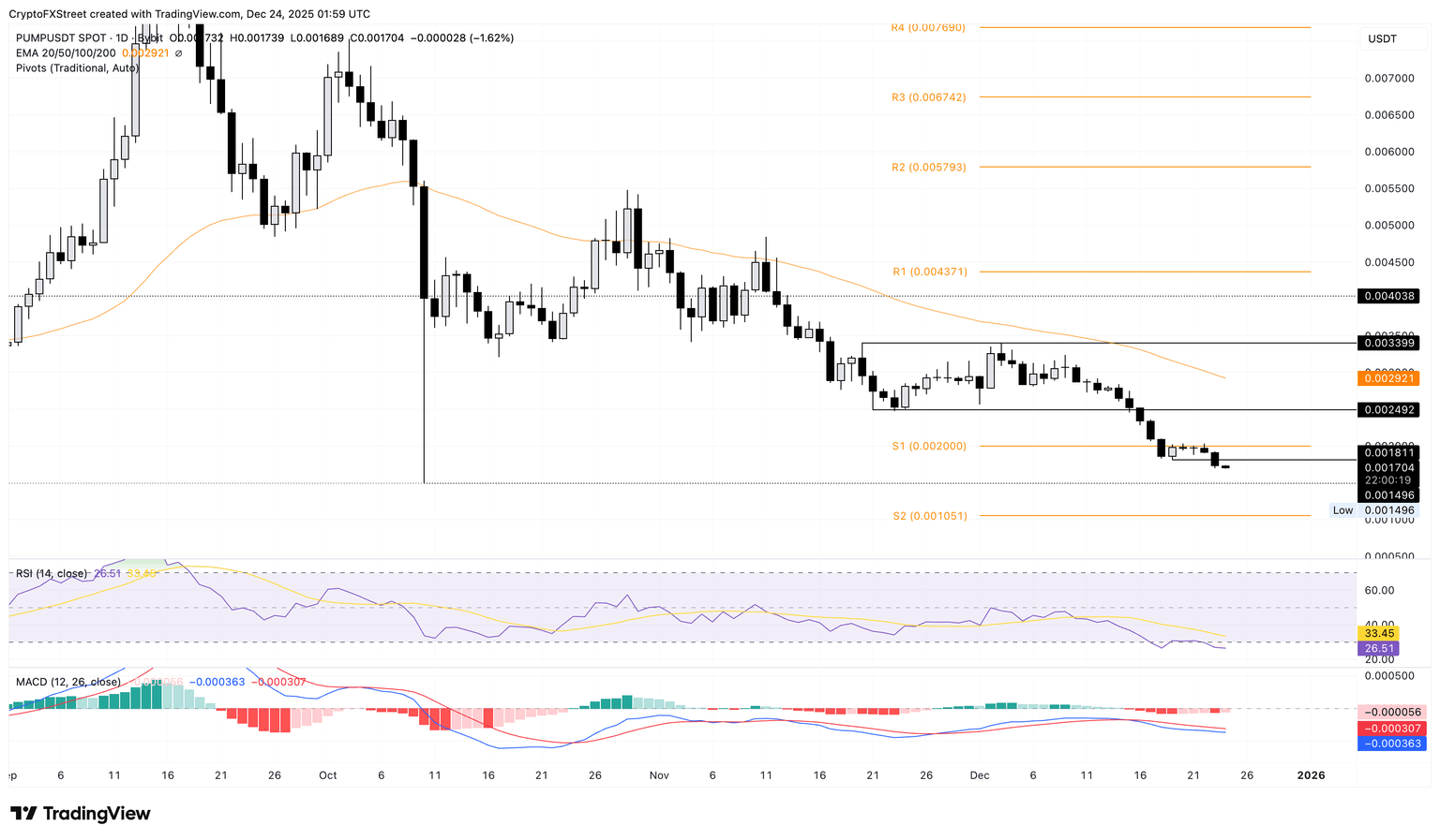 Pump.fun 周一下跌 3% 后,跌破 0.002000 美元心理关口,跌势延续。截至发稿时,PUMP 周三下跌 2%,连续第三个交易日走低。