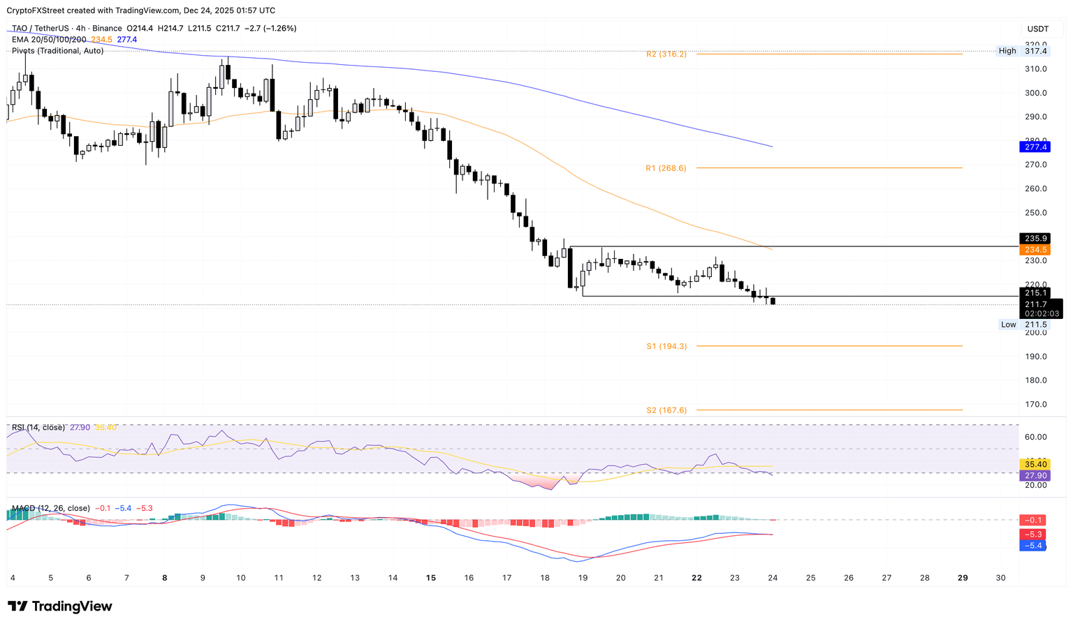 Bittensor跌破短期支撑位215美元后,正逼近200美元的心理关口,该支撑位与上周五的低点重合。TAO则面临跌破200美元关口的风险,并可能测试位于194美元的S1枢轴点。