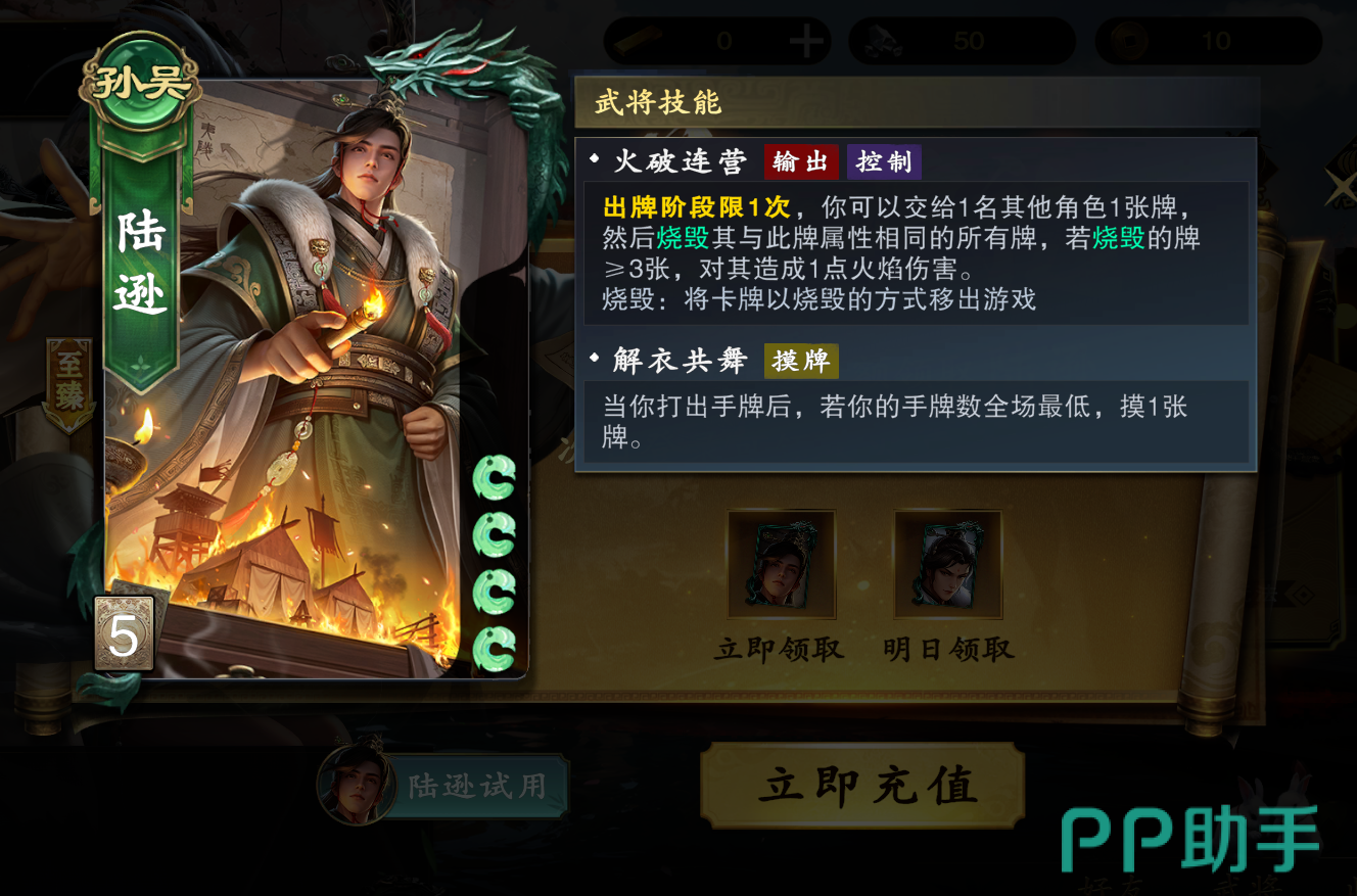 首次充值任意金额(无最低门槛限制),即可永久解锁武将陆逊。其技能“火烧连营”具备强制弃牌效果,可令对手手牌上限降低并触发连锁响应,在控场与节奏压制方面表现突出,是新手过渡与中期阵容构筑的关键角色。